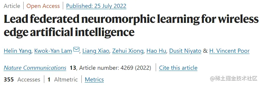 该研究以「Lead federated neuromorphic learning for wireless edge artificial intelligence」为题,于 2022 年 7 月 25 日发布在《Nature Communications》。