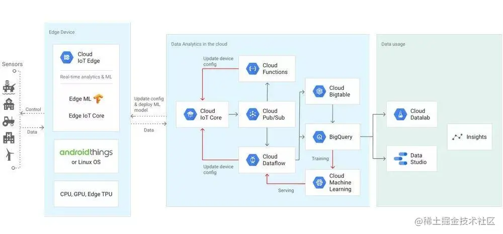 - Edge IoT Core runtime,能更安全地将边缘设备连接到云,支持软件和固件更新,并通过Cloud IoT Core管理数据交换。