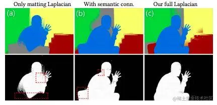 图4. 不同处理流程效果比较。(a)仅使用Laplacian matting(b)结合使用Laplacian matting和语义分割 (c)进一步利用稀疏颜色连接方法。