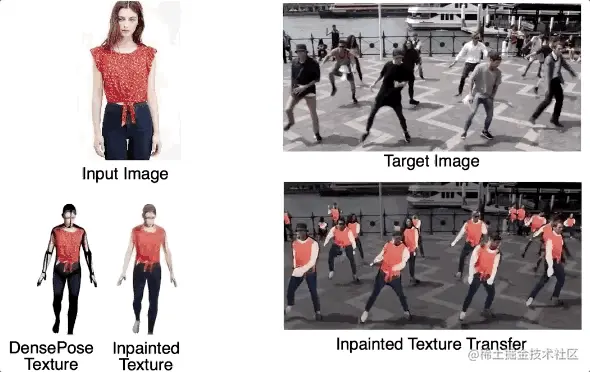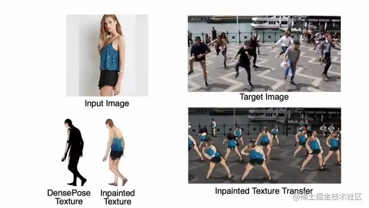 最近,该团队更进一步,发布了基于 DensePose 的一个姿势转换系统:Dense Pose Transfer,仅根据一张输入图像和目标姿势,创造出 “数字化身” 的动画效果。