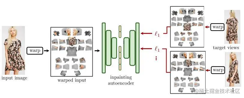 如图 3 所示,在修复过程(inpainting process),可以观察到一个均匀的表面,捕捉了皮肤和贴身衣服的外观,但没有考虑头发、裙子或外衣,因为这些不适合 DensePose的表面模型。