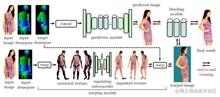 变形模块使用 DensePose 表面对应和图像修复(inpainting)来生成人物的新视图,而预测模块是一个通用的黑盒生成模型,以输入和目标的 DensePose 输出作为条件。