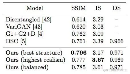 表 1 显示,我们的 pipeline 在结构逼真度(structural fidelity)方面有显著优势。在以IS 作为指标的感知质量方面,我们模型的输出生成具有更高的质量,或可与现有工作相媲美。