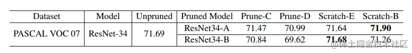 表7:用于检测任务的剪枝结果(mAP)。Prune-C指的是剪枝分类预训练的权重,Prune-D指的是在权重转移到检测任务后剪枝。 Scratch-E / B表示从头开始训练分类剪枝模型,移至检测任务。
