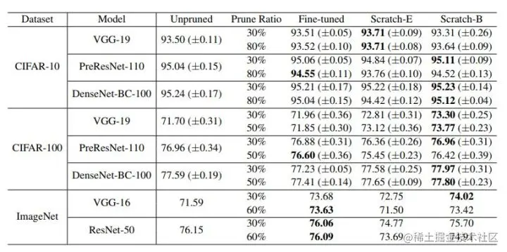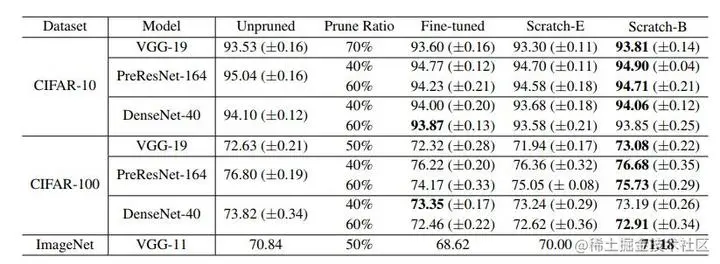 作者说:“对于采用预定义目标网络架构的剪枝算法,可以摆脱整个pipeline并直接从头开始训练目标网络。我们的观察结果对于具有多种网络架构,数据集和任务的各种剪枝算法是一致的。”