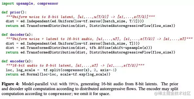 图4实现了一个模型并行的变分自动编码器(model-parallel VAE),它由decoder、prior和encoder组成。decoder生成16位音频;它采用一种自回归的flow,用于训练有效地在序列长度上并行化。encoder将每个样本压缩成粗分辨率,由一个压缩函数参数化。