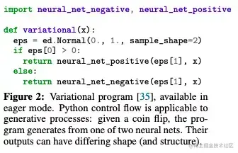 Edward2将任何可计算的概率分布具体化为一个Python函数(程序)。通常,该函数执行生成过程,并返回示例。程序的输入—以及任何限定范围的Python变量—表示分布条件的值。