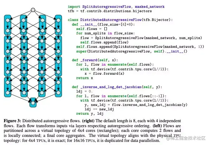 TPU集群在环形网络中布置核心,例如,512个核心可以布置为16x16x2的环面互连。为了利用集群, prior和decoder都应用分布式自回归流(如图3所示)。