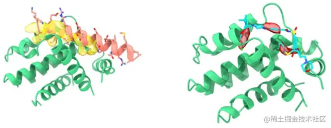 图示:(左)Bcl-2 的 InDeep 交互性补丁预测;(右)在 Bcl-2 表面上进行的配位性预测。