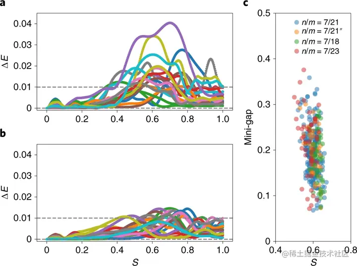 分别在图 5a、b 中仔细研究了 SD 或 QZero 退火 schedule 后基态能量与时间演化量子态的预期能量之间的差异。能量差 ΔE 反映了沿不同路径违反绝热性的强度。如图所示,预训练的 QZero 不仅能够找到最佳解决方案,而且能够比 SD 更好地执行绝热性。
