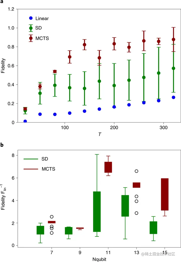 SD(随机下降) 单次运行需要对量子退火器进行大约 100 次查询以进行能量反馈,而 MCTS 的一集大约需要 50 次这样的查询。因此,为了公平比较对量子退火器的查询,认为 MCTS 集的数量是 SD 运行的两倍(即 40×100=80×50)。根据图 3a,SD 的那些大误差条表示一个复杂的优化环境,包括多个局部最小值,其中 SD 很容易陷入其中。另一方面,对量子退火器使用大致相同数量的查询,MCTS 找到的解决方案获得更高的成功概率。