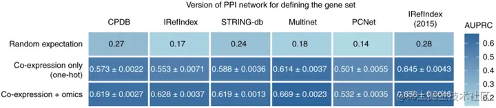 为了测试共表达网络是否对预测癌症基因有用,研究人员从 COXPRESdb8 下载了人类基因共表达数据。使用相互等级阈值,构建了一个主共表达网络。为了直接与 PPI 结果进行比较,他们通过仅保留主共表达网络中也分别存在于六个版本的 PPI 网络中的基因,生成了六个不同版本的共表达网络;同时,使用共表达网络和多组学特征或仅使用共表达网络对癌症基因进行建模。基于共表达网络与来自 CPDB PPI 网络的基因的验证集性能,使用网格搜索调整超参数。