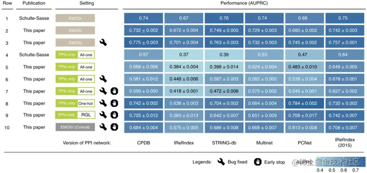 对于人类 PPI 网络的所有六个版本,他们的平均 AUPRC 值接近原始论文中报告的值,偏离其报告值的 -1.486% 至 0.298%。偏差可能是由于 EMOJI 代码中缺少固定的随机种子以及 TensorFlow 中某些图形处理单元(GPU)函数的非确定性实现。