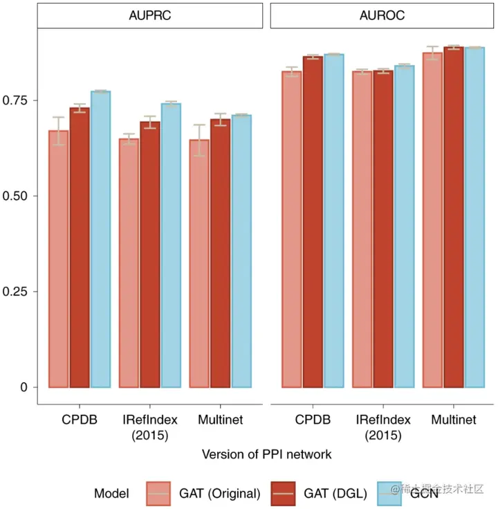 总的来说,两种 GAT 实现的性能都低于 GCN,并且在 AUROC(area under the receiver–operator characteristics)方面的性能差距更小,这与之前一些研究的结果一致。