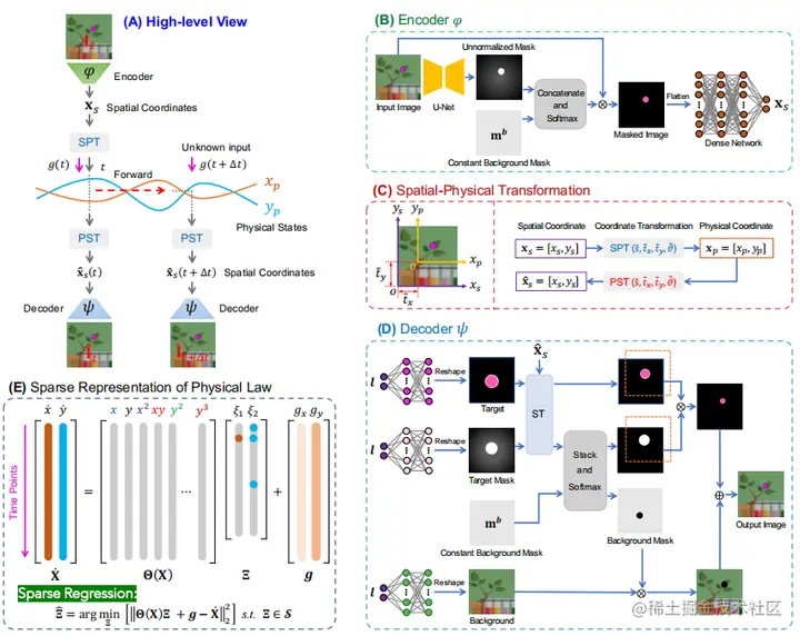 与现有的深度学习方法通常从运动物体的空间/像素坐标轨迹中发现物理规律不同,研究人员所提方法从回归物理坐标系中的物理状态揭示了显式控制方程,这使得发现更复杂的动力系统成为可能。此外,物理状态的提取不是独立于编码器-解码器和物理坐标系回归,而是在底层物理定律的约束下进行的。联合优化不仅有助于物理状态的提取,而且导致了封闭形式的控制方程和未知输入的识别。