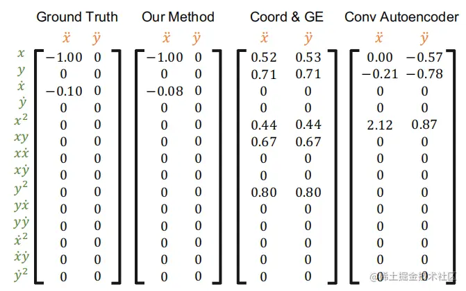 目前,直接从视频中发现具有未知输入的动态系统的控制方程方面的文献仍然很少。研究人员将图 2 中所示的坐标一致编码器解码器替换为传统的卷积编码器-解码器,并将得到的方法作为另一个基线。发现该网络能够从视频中提取物理定律。由于提取的潜在变量不能正确地表示基于位置的物理状态,该方法未能揭示潜在的物理规律。此外,传统的自动编码器无法保证运动物体的物理状态和真实位置之间的固定关系。