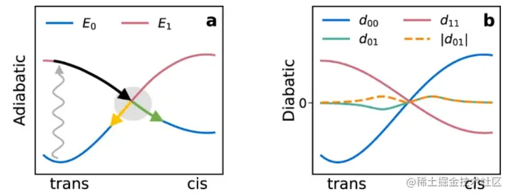 Diabatization 也可能被证明对反应性基态有用。反应势垒通常可以理解为从一种绝热状态到另一种绝热状态的转变。非绝热基础可以使反应表面更容易适应神经网络。