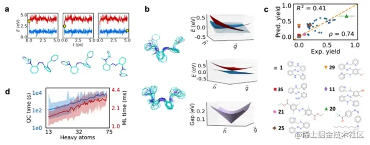 该团队还确定了几种具有高量子产率、红移激发能量和反转稳定性的假设化合物。训练数据的网络架构、非分解方法以及化学和配置多样性使模型能够产生强大且可转移的潜力。该模型可以现成地应用于新分子,产生的结果近似于 SF-TDDFT 的结果,计算成本降低了几个数量级。