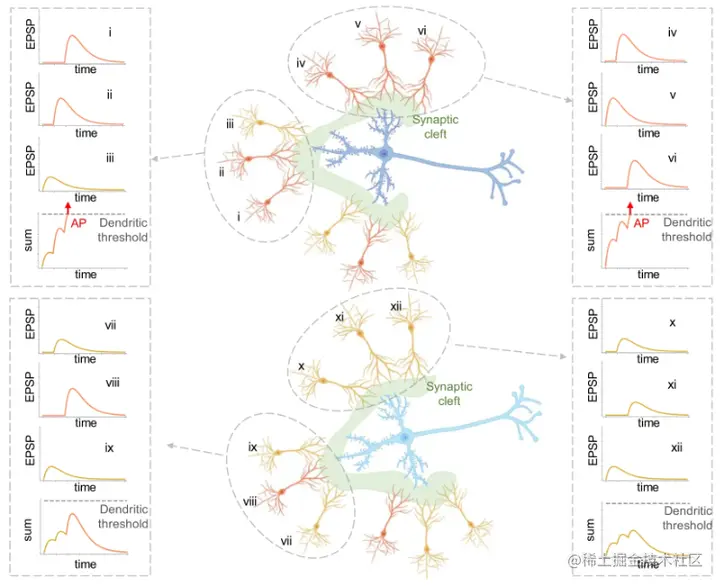 克服这一限制可能是使人工网络的性能更接近动物智能的关键。突触整合是神经元在产生动作电位 (AP) 之前结合数千个突触前神经元接收到的尖峰序列的过程。轴突 AP 在细胞的轴突中被引出,作为对从细胞树突接收到的输入的响应,并充当神经元的整体输出信号。