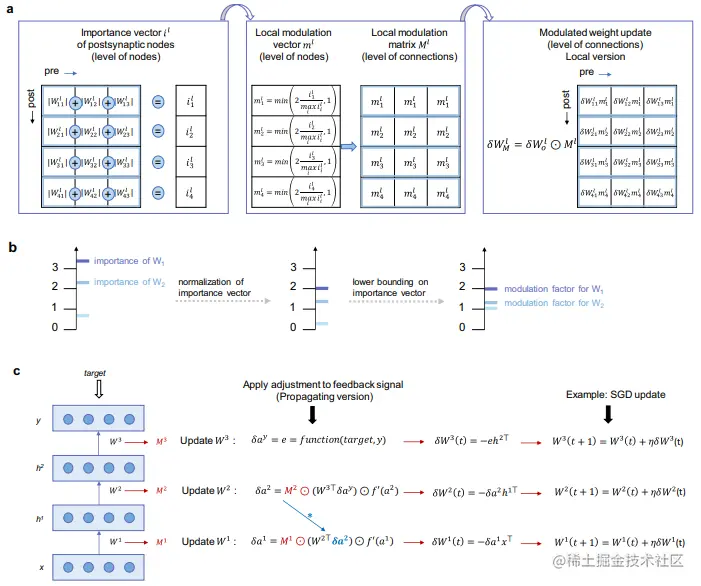 首先,轴突后信号通过调节突触更新来控制突触的可塑性。类似地,GRAPES 中使用重要性向量来调节 BP 规定的权重变化。其次,携带体重强度和体重变化信息的轴突后信号传播缓慢;同样,GRAPES 中的信息仅在每批之后应用。第三,通过神经营养因子传播的信息和 GRAPES 中的重要性都不依赖于梯度。最后,Sarah N. Lewis 的理论引入了细胞价值的概念,它衡量了细胞输出的有用性,并被定义为如果细胞死亡,网络性能的恶化。