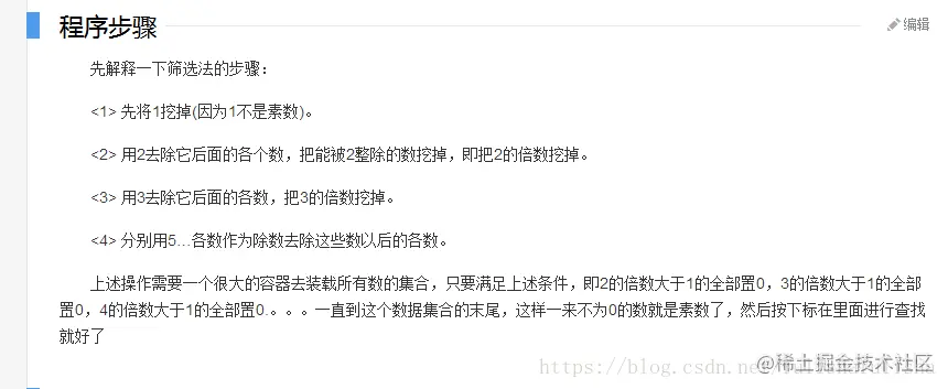 这是百度的意思,我个人理解的意思就是:比如求1-N的素数,我们首先把2的倍数的筛选出来滤掉,3的倍数滤掉,4不用(因为在2的时候已经滤过了)5的倍数也滤掉,6同理4,7的倍数滤掉.............,我们这样只需要这样循环到sqrt(n)就ok了,(具体原因看上一节内容)