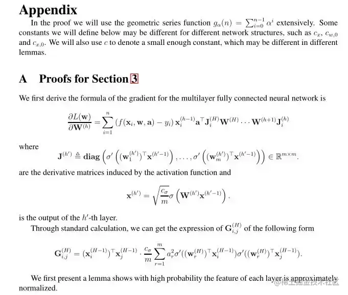 接下来,论文分别给出了全连接前馈神经网络、ResNet 和卷积 ResNet 的分析过程,并在长达 20 余页的附录部分(本文含附录共计 45 页)给出了详细的数学证明过程,对自己的数学功底有自信的读者可以自行参看论文。这里仅就 ResNet 分析过程中,Gram 矩阵的构建和研究假设做简要说明。