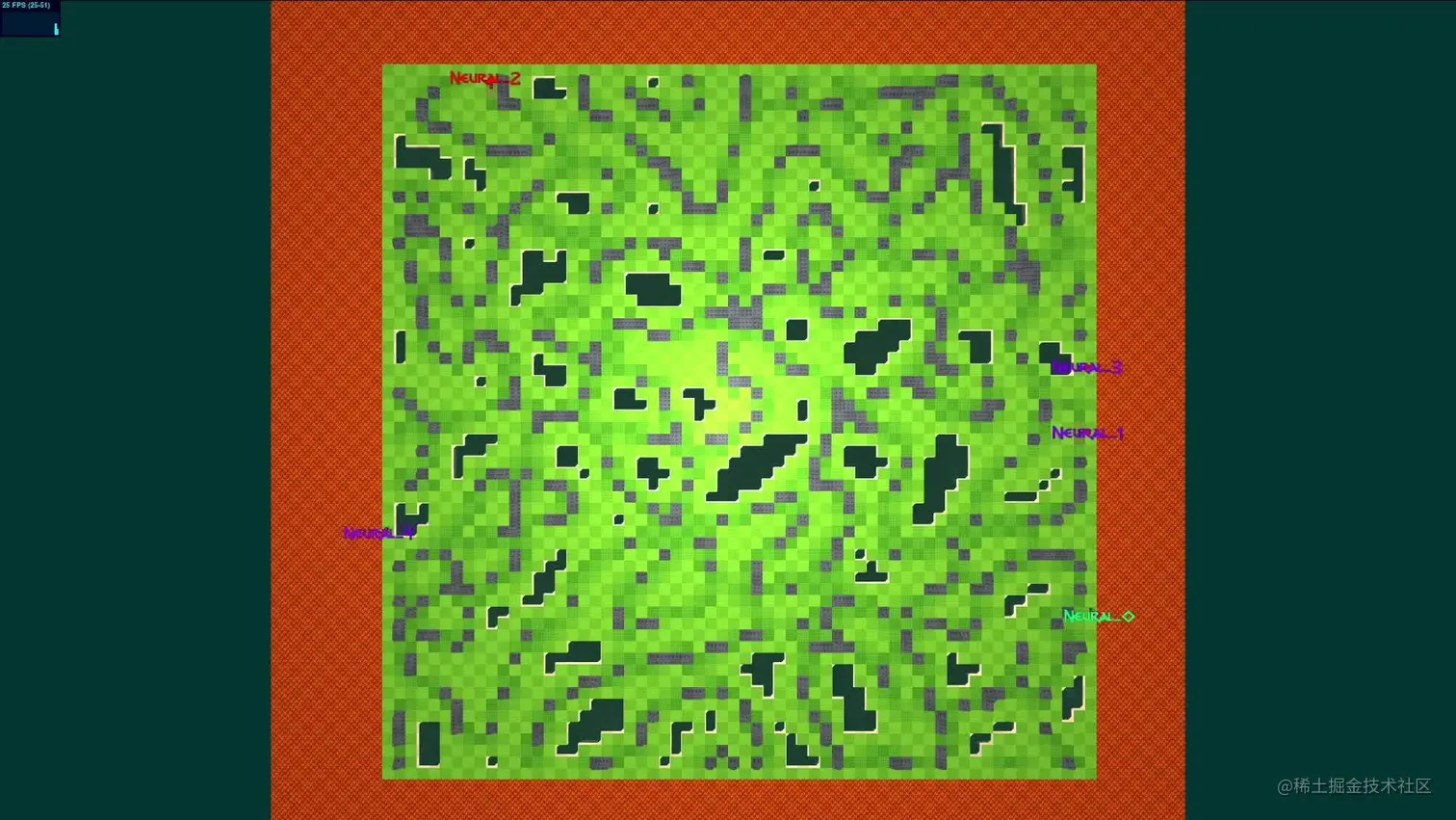 AI 智能体在 Neural MMO 环境中随机生成,Neural MMO 环境中还包含自动生成的预定大小的瓦片地图 (tile maps)。其中一些 tile 是可穿越的,如 “森林”(里边有食物),其他则不能穿越 (如水和石头)。