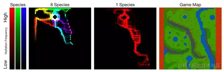 物种数量 (populations 的数量) 放大了生态位形成 (niche formation)。探索地图覆盖了游戏地图;不同的颜色对应不同的物种。训练单一种群往往会产生单一的深度探索路径。训练 8 个种群会导致许多更浅的路径:种群分散以避免物种间的竞争。