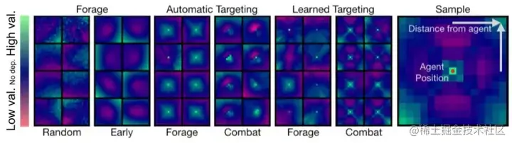 每个方形地图显示了位于地图中心的智能体对其周围智能体存在的响应。我们展示了初始化和训练早期的觅食地图,额外的依赖关系图对应于不同的觅食和战斗形式。