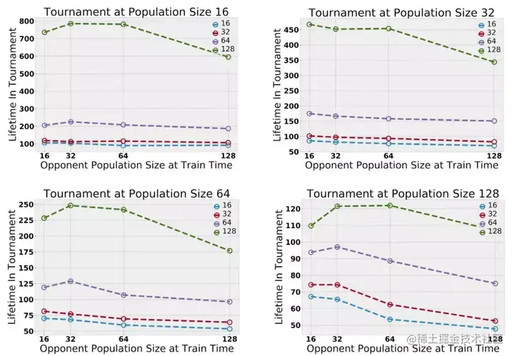 训练时的最大 population size 在 (16、32、64、128) 之间。为了提高效率,策略在由 16 个智能体组成的组之间共享。在测试时,我们将在成对实验中的 populations 合并,并在一个固定的 population size 下评估 lifetime。我们只对觅食任务进行评估,因为作战策略更难直接比较。结果显示,在更大的 population 中训练出来的智能体总是表现得更好。