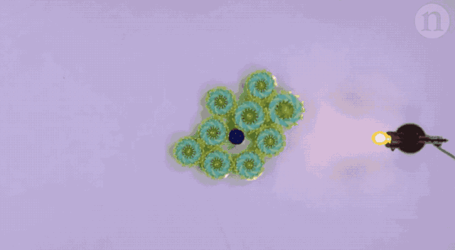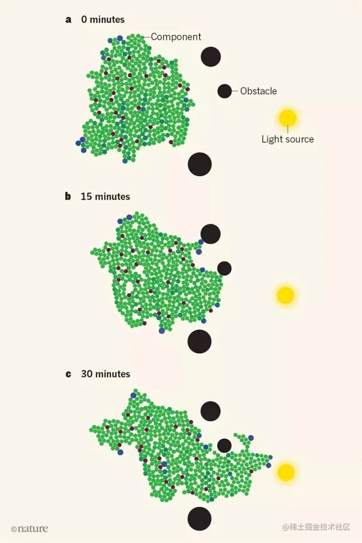 在没有外部刺激的情况下,系统只能随机移动。然而,当组件被编程来调整它们的直径以响应不同的环境信号时,就会集体向信号源移动。