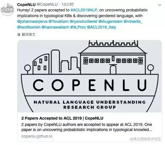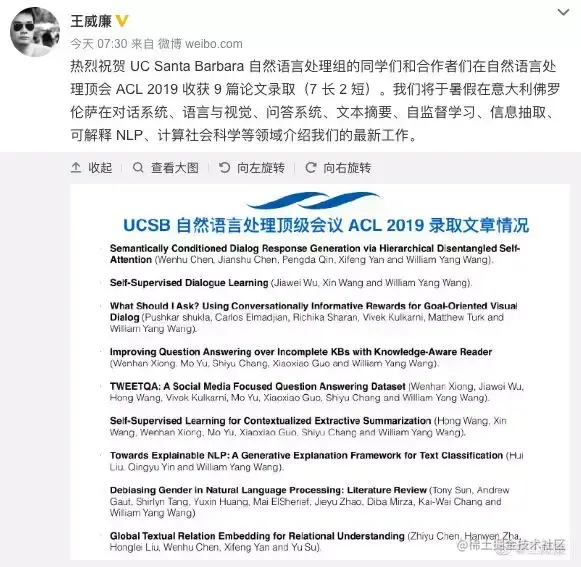 推特上已经有许多作者欢欣鼓舞自己的论文 “中了!” 比如加州大学圣芭芭拉分校王威廉老师所在的自然语言处理组有 9 篇论文被录取。王威廉也是 ACL 19 机器学习的领域主席。