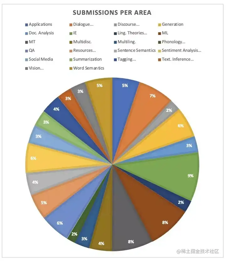 - 信息提取和文本挖掘 (占所有有效提交的 9.2%,ACL 2018 的这一比例为 11.5%。不过,由于今年的会议增加了一个 “应用” 领域,百分比不完全具有可比性)