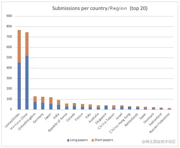 最后,关于论文的地理分布,今年 ACL 收到了来自 61 个国家的论文。