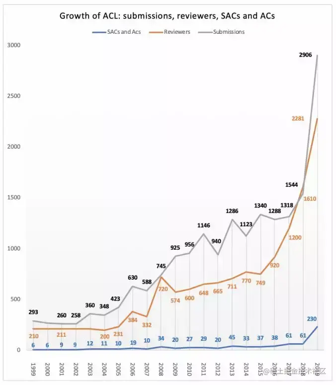 下图显示了 ACL 在过去 20 年里的论文投稿情况,包括提交数、评审人数和 SAC 和 AC 的人数。