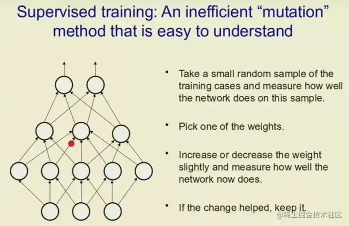 - 监督训练:向网络显示一个输入向量,并告诉它正确的输出;调整权重,减少正确输出与实际输出之间的差异。
