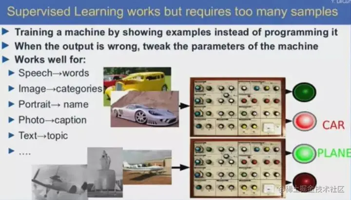 Jeff刚才提到了监督学习,监督学习在数据量很大时效果很好,可以做语音识别、图像识别、面部识别、从图片生成属性、机器翻译等。