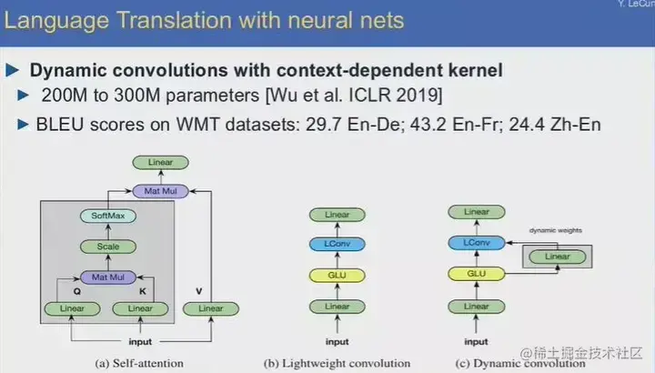 在翻译应用上,采用了许多网络架构上的创新,如自注意力机制、轻量卷积、动态卷积等,实现基于语境的动态卷积网络内核。在ICML2019上的最新机器翻译卷积网络模型,其参数数量达到200M至300M,WMT数据集上的BLEU得分:英语-德语29.7,英语-法语43.2,汉语-英语24.4。