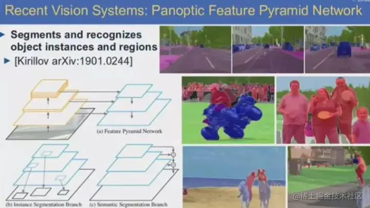最近的视觉识别系统的一个范例是Facebook的“全景特征金字塔网络”,可以通过多层路径提取图像特征,由多层路径特征生成输出图像,其中包含图像中全部实例和目标的掩模,并输出分类结果,告诉你图像中目标的分类信息。不仅是目标本身的分类,还包括背景、材质等分类,比如草地、沙地、树林等。可以想象,这种系统对于自动驾驶会很有用。