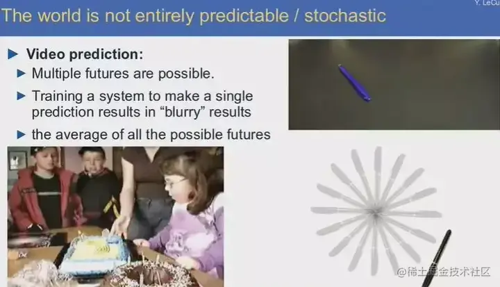 为什么?因为这世界并不全是可预测的。对于视频预测任务,结果可能有多重可能,训练系统做出唯一一种预测的结果往往会得到唯一“模糊”的结果,即所有未来结果的“平均”。这并不是理想的预测。