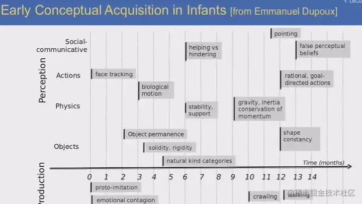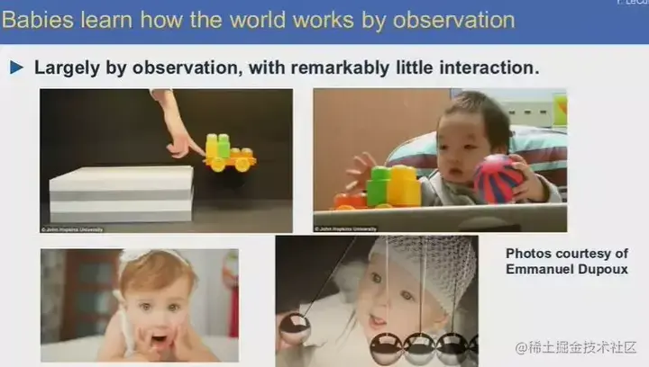 上图显示了婴儿学习早期概念和语言的过程。婴儿基本上是通过观察学习这个世界的,但其中也有一小部分是通过交流。