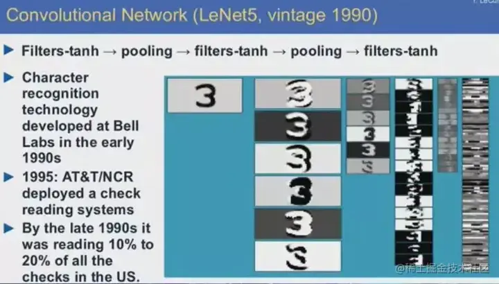 如果神经网络具有某些特殊架构,比如Jeff在上世纪八九十年代提出的那些架构,可以识别手写文字,效果很好,到上世纪90年代末时,我在贝尔实验室研发的这类系统承担了全美手写文字识别工作的10%-20%,不仅在技术上,而且在商业上也是一个成功。