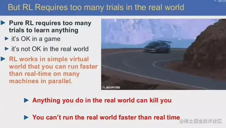 这种海量重复试验的方式在现实中显然不可行,如果你想教一个机器人抓取目标,或者教一台自动驾驶车学会驾驶,如此多的重复次数是不行的。纯粹的强化学习只能适用于虚拟世界,那里的尝试速度要远远快于现实世界。