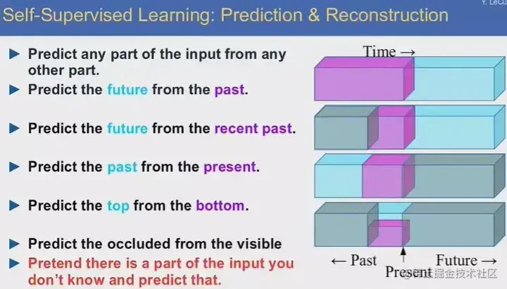 以视频内容预测为例,给定一段视频数据,从其中一段视频内容预测另外一段空白处的内容。自监督学习的典型场景是,事先不公布要空出哪一段内容,实际上根本不用真的留出空白,只是让系统根据一些限制条件来对输入进行重建。系统只通过观察来完成任务,无需外部交互,学习效率更高。