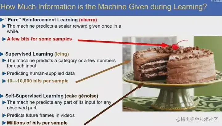 机器在学习过程中被输入了多少信息?对于纯强化学习而言,获得了一些样本的部分碎片信息(就像蛋糕上的樱桃)。对于监督学习,每个样本获得10-10000bit信息(蛋糕表面的冰层),对于半监督学习,每个样本可获得数百万bit的信息(整个蛋糕内部)。