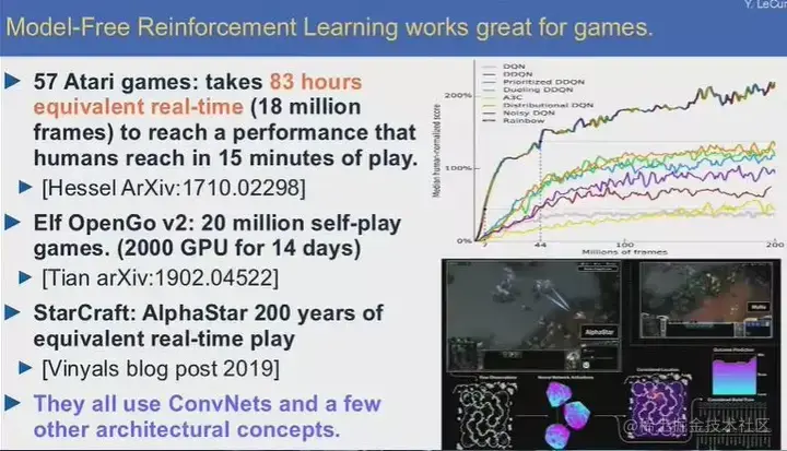 无模型强化学习很适合游戏领域应用。现在强化学习领域的一大问题就是数据的缺乏,使用强化学习训练系统需要大量的重复试验和试错,要达到人类训练15分钟的水平,机器需要大概80小时的实时游戏,对于围棋来说,要达到超人的水平,机器需要完成大约2000万盘的自对弈。Deepmind最近的《星际争霸2》AI则完成了大约200年的游戏时间。