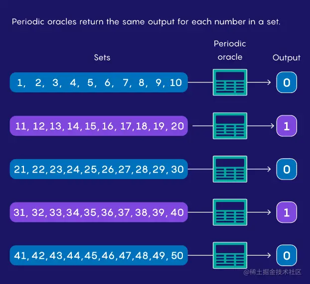 它们可能具有随机行为,如果输入在某个随机范围内(例如,12 到 67)输出「是」,否则输出「否」。或者它们可能是周期性的,因此 1 到 10 之间的输入返回「是」,11 到 20 产生「否」,21 到 30 再次产生「是」,依此类推。