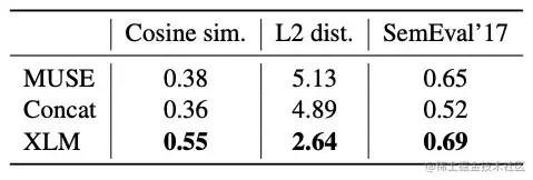 表 5:无监督跨语言词嵌入源词与其译文之间的余弦相似度和 L2 distance。