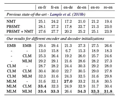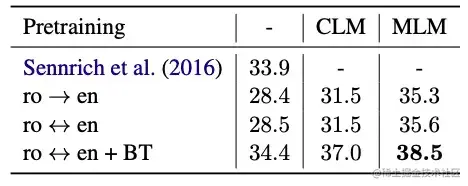 表 2:WMT’14 英语 - 法语, WMT’16 德语 - 英语 以及 WMT’16 罗马尼亚语 - 英语的无监督机器翻译 BLEU 分数结果。前两列表示用于预训练编码器和解码器的模型。“-” 表示模型被随机初始化,CLM 和 MLM 对应于针对 CLM 或 MLM 目标的模型的预训练。