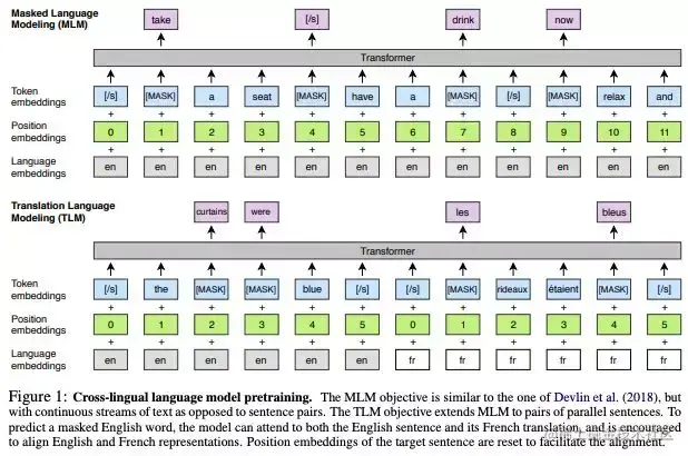 图 1: 跨语言模型预训练。 MLM 目标类似于 Devlin et al. (2018) 里的,但不是句子对,是连续的文本流。TLM 目标将 MLM 扩展到并行句子对。为了预测一个被遮挡的英语单词,该模型可以同时考虑英语句子及其法语翻译,并鼓励将英语和法语表示对齐。目标句子的位置嵌入被重置以方便对齐。